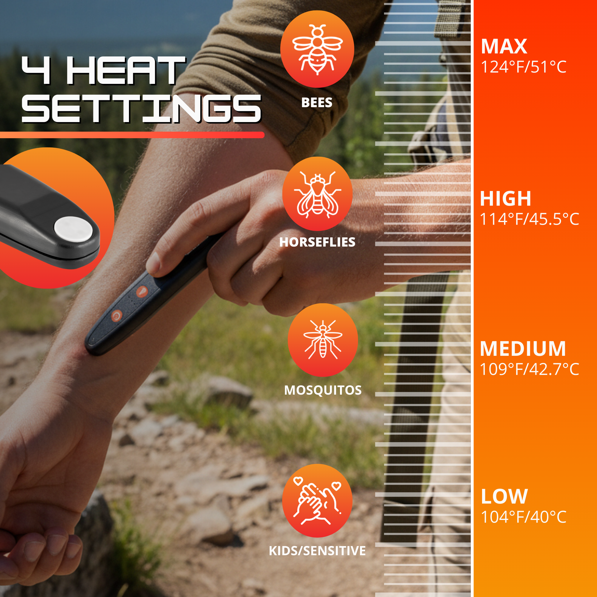 4 ADJUSTABLE INTENSITIES: Multi-Level Heat Settings. Allows you to customize the treatment based on skin sensitivity and the type of sting. Switch to "Max" for stubborn wasp stings or "Low" for delicate skin.